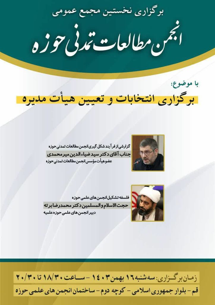 متن سربرگ#اطلاعرسانی نخستین مجمع عمومی انجمن مطالعات تمدنی حوزه با محوریت «برگزاری انتخابات و تعیین هيأت مدیره» برگزار میگردد.سخنران اول: دکتر میرمحمدیسخنران دوم: دکتر برته#زمان: سه شنبه ۱۶ بهمن ۱۴۰۳ ساعت ۱۸/۳۰#مکان: قم، بلوار جمهوری اسلامی، کوچه ۲، فرعی اول سمت چپ، ساختمان انجمنهای علمی حوزه#منبعخبر: انجمن علمی تاریخ و تمدن اسلامی @r_kh_tarikhلازم به ذکر است که حضوری ثبتنام کنندگان در انجمن، در این جلسه #الزامی است.#0311_443http://eitaa.com/mir_mohammadi5050 خود را وارد کنید